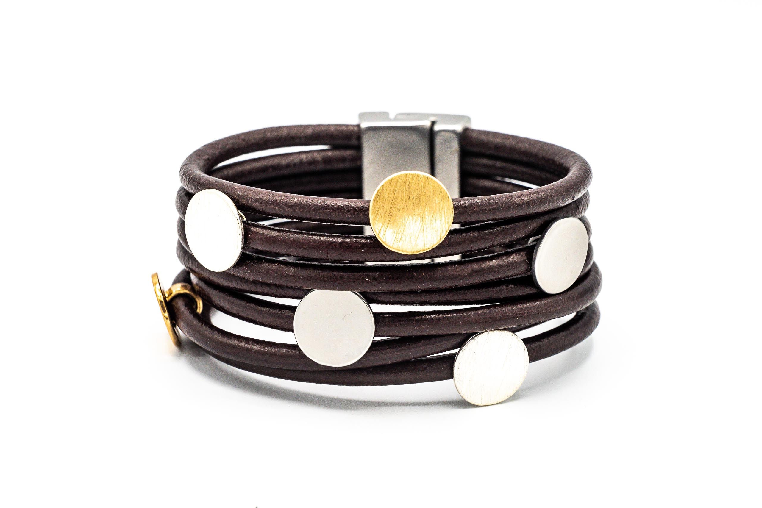 BRACCIALE A CALAMITA FILI PELLE PALLINE METALLO ZAMA BAGNO IN ARGENTO+ORO OPACO XS282